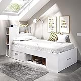 - La Cama Juvenil Mek está acabada en color Blanco, para que la puedas combinar fácilmente con el resto del mobiliario y decoración del dormitorio de tu hijo. La cama incluye 3 cajones con tirador y ruedas para que puedas guardar los juguetes y tener la habitación recogida. La cama se ha diseñado para colchones y somieres de 90x190 cm (no incluidos) con soportes metálicos para el somier.