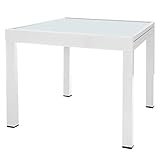 - Mesa de comedor para jardín, extensible de 2 hojas, en formato cuadrado, está fabricada con un sólido pie de 4 patas con estructura metálica tubular cuadrada, de resistente aluminio lacado en pintura para exteriores de color blanco, la encimera es de cristal templado de seguridad de 5 mm., con un elegante acabado esmerilado blanco.
