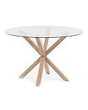- Mesa con sobre de cristal templado de 10 mm. de grosor y patas de madera de haya natural con conectores metálicos negros.