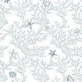 JOLIHOME Azul y Blanco Papel Pintado Autoadhesivo Efecto Vida Marina Pelar y Pegar Papel de Contacto Coral Estrella de Mar Conchas Patrón Pegatina Pared Vinilo Rollos para Baño Encimera 44.5x500cm