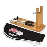 • [DIMENSIONES]Base jamon: 42 cm Largo (para jamones y paletillas) x 16 cm Ancho; Grosor base jamonero: 2.2 cm - Altura del soporte jamon: 27 cm. Cuchillo Jamonero en Acero Inoxidable con Alveólos de 24 cm de hoja y Afilador Cuchillos - Chaira de Acero Inox de 20 cm de hoja.